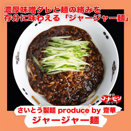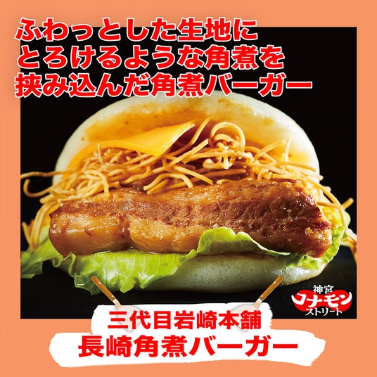 長崎のソウルフードであり、おみやげとしても全国区の知名度を誇る角煮まんじゅうの代表的店舗【三代目岩崎本舗】がとろけるような角煮を挟み込んだフワフワジューシーな「長崎角煮バーガー」を提供。京都東山で生まれた製麺所【さいとう製麺】が丹精込めて作る全てが最高レベルの唯一無二の麺を使用した究極の一杯が中華料理の名店【齋華】のプロデュースで誕生!濃厚味噌ダレの麺の絡みを存分に味わえる「ジャージャー麺」をご堪能ください。