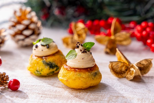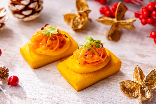 紅茶やコーヒーはもちろん、ワインとの相性もよいお食事パンもクリスマスらしいラインアップをご用意しています。ほうれん草とベーコンのパウンドケーキに無花果のマーマレードを合わせたクリームチーズホイップを絞った「ほうれん草ベーコンのケークサレ」、鮮やかなオレンジ色の「にんじんのフォカッチャ サーモンタルタル」、トリュフ入りクロワッサン生地でカップを作り、ビーツ、オレンジ、デーツのサラダを彩りよく配した「ビーツ・オレンジサラダ トリュフクロワッサン」、厚切りのビーフフィレを贅沢に用いた「ビーフステーキバーガートリュフソース」などをゆったりとお楽しみいただけます。