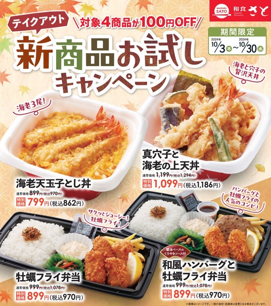 国内197店舗を展開する「和食さと」では、「新商品お試しキャンペーン」と題して、テイクアウトの新作メニューの4品を【108円OFF】で販売する特別キャンペーンを10月3日(木)から開催します。