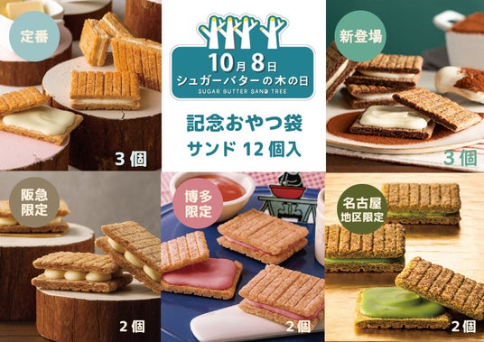 10月8日の「シュガーバターの木の日」を記念した『シュガーバターの木 おやつ袋』。定番ホワイトショコラサンドに秋の新作「ティラミス風」、そして3つの地域限定サンドが入ったスペシャルセットです。普段はなかなか手に入らない味も、いまだけみ~んな一緒に楽しめちゃうチャンス。ぜひ食べ比べながらそれぞれの美味しさをお楽しみください。