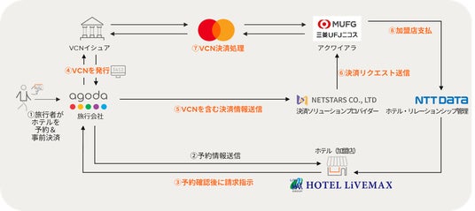 この仕組みでは、旅行者の予約情報を元にAgodaがVCNを発行した後、ネットスターズによるストレートスループロセッシング(STP*2)にてVCNによる決済処理が行われます。これにより、リブマックスホテルは手作業を介さずに直接バーチャルカード決済を行うことが可能になります。