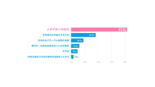 外国人人材を採用した理由については「人手不足への対応(83.5%)」が最も多く、次いで「多言語対応を強化するため(36.5%)」「将来的なグローバル展開の準備(18.3%)」「専門的・技術的知識を持つ人材の確保(12.2%)」「その他(9.6%)」でした。この結果により、多くの宿泊施設が「人手不足への対応」として、外国人人材の採用を行っているということがわかります。