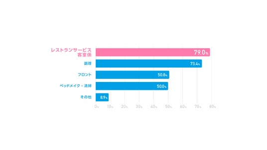 人手不足を感じていると回答した宿泊施設に対して、どんな職種で人手が不足しているのか調べたところ「レストランサービス・接客係(79.0%)」が最も多く、次いで「調理(73.4%)」があげられました。