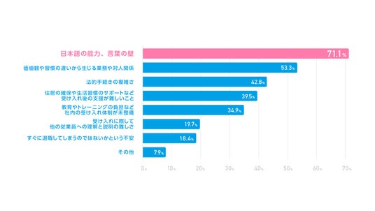 特定技能外国人材の採用における課題は、日本語能力や言葉の壁が7割を超える