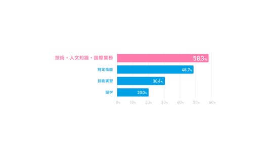 採用した外国人人材の在留資格は「技術・人文知識・国際業務」が最も多い