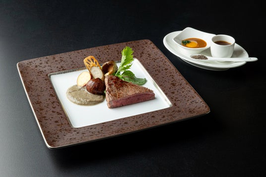 能登牛ランプ肉を「越前塩とブラックオリーブ」「雲丹醤とウズラ卵」「柑なんばとシャリアピンソース」へお好みに合わせてディップしてお愉しみください。