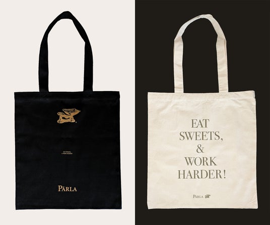 10周年を迎えることを記念し、初のオフィシャルグッズとして、お菓子などの持ち運びにも最適なトートバッグも作成しました。デザイン違いの黒と白の2カラーで、どちらも当ブランドのロゴと、
