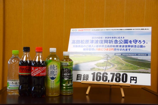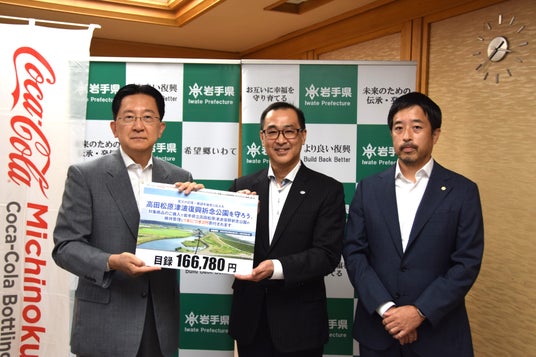 みちのくコカ・コーラボトリング株式会社(本社: 岩手県盛岡市、代表取締役社長: 谷村 広和、以下「当社」)は、株式会社マイヤ(本社: 岩手県大船渡市、代表取締役社長: 井原 良幸、以下「マイヤ」)との共同企画「高田松原津波復興祈念公園を守ろう。」キャンペーンを実施し、10月1日(火)、岩手県知事 達増 拓也 様 へ寄付金の目録を贈呈いたしました。