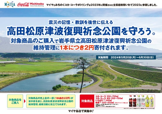 このキャンペーンは、震災の記憶・教訓を風化させることなく、後世に伝えることを目的として、5月20日(月)から6月30日(日)までの期間、マイヤ・びはん全20店舗での店頭キャンペーンとして展開したものです。対象製品の売上の一部が岩手県へ寄付され、高田松原津波復興祈念公園の維持・管理に活用されます。