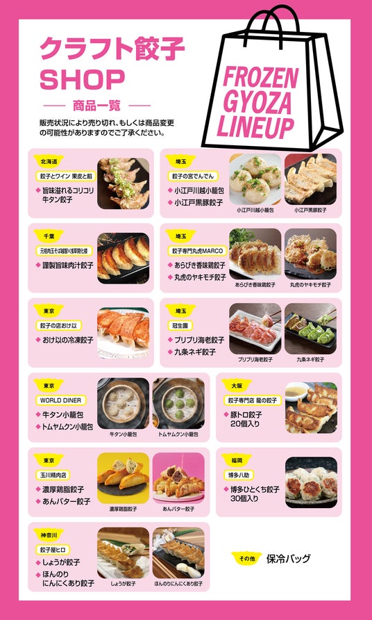 会場に設置される「クラフト餃子SHOP」では、人気餃子メニューをご自宅でさらにお楽しみいただける冷凍餃子を販売いたします。お気に入りの餃子を見つけて是非お持ち帰りください。