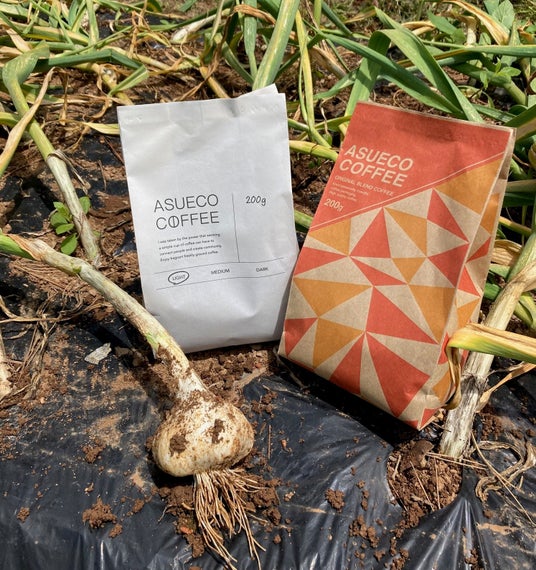 ナカバヤシの兵庫関宮工場で加工、製袋を行っているコーヒー豆パッケージ「asueco」を、コーヒーを抽出する際に残るコーヒーかすの堆肥化に合わせて混ぜ込み分解させ、2023年秋にナカバヤシが保有する兵庫県のにんにく圃場に散布しました。2024年6月にはにんにくを収穫し、分解した「asueco」入り堆肥の農業利用実験が成功したことを確認しました。
