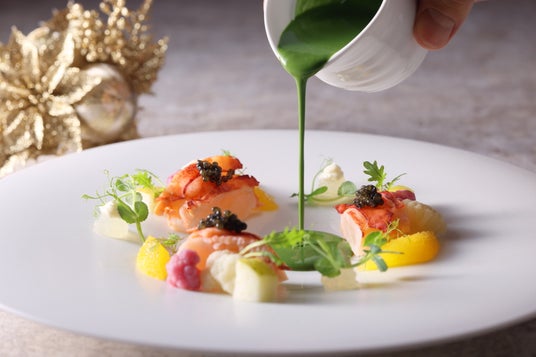 サステナブル・グリル料理で名を馳せる米澤文雄氏がコンサルタントシェフを務めるイタリア料理「FORNI(フォルニ)」のクリスマスコース。オマール海老とキャビアのサラダに、風味豊かな青リンゴと生姜で仕上げたソースを合わせた前菜。そして、滋味深い鹿肉を使ったサフランリゾットや国産牛のグリルなどをご堪能いただけます。