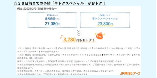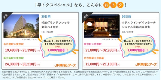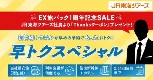 株式会社ジェイアール東海ツアーズ(本社:東京都中央区、以下JR東海ツアーズ)は、2024年10月1日より、EX旅パック販売開始から1周年を記念したSALEを開催します。このSALEは30・45・60・90日以上前の旅行予約において、早めに予約すればするほど旅行代金がおトクになる価格にこだわった商品「早トクスペシャル」を対象に、弊社社長より感謝を込めて「1,000円割引Thanksクーポン」をプレゼントし、もっとおトクに新幹線旅行を楽しんでいただく企画です。クーポンは期間中であれば何度でもご利用いただけます。この機会に、新幹線とホテルを個別で予約するよりおトクなEX旅パック(新幹線+ホテル)を予約し、旅先で感動体験を!