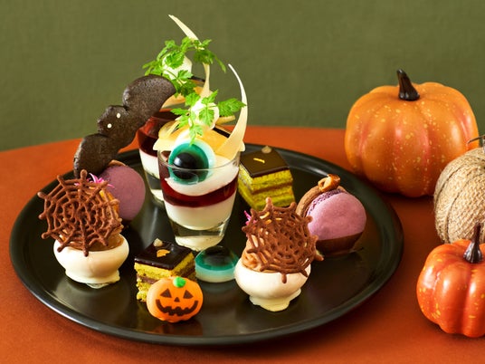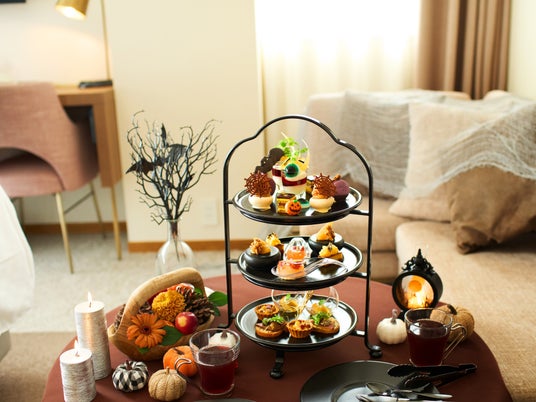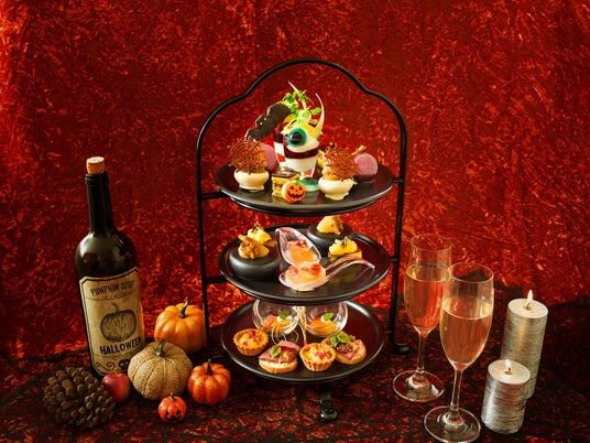 ご宿泊のお客様にウェルカムサービスとして提供する秋のアフタヌーンティーは、ぶどうやカシスなど旬のフルーツをふんだんに取り入れた繊細なスイーツがラインナップ。2024年10月1日(火)から11月7日(木)までのハロウィンシーズンは、トップティアを期間限定のアレンジで提供します。コウモリや目玉といったミステリアスながらもポップなモチーフで飾りつけられたアフタヌーンティーが、客室で楽しむハロウィンパーティーを華やかに演出します。