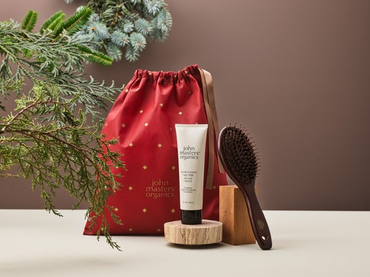 みずみずしくなめらかな髪へ導くアウトバス用ヘアミルクと、広がる髪にまとまりとツヤを与える猪毛+イオン毛の混合ブラシの組み合わせ。乾燥の気になる季節に水分と油分をしっかりチャージ。潤いに満ちた指通りなめらかなツヤ髪へと導き、翌朝のスタイリングにまとまりもプラス。