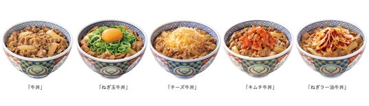 「牛丼」トッピングメニュー全サイズ(「ねぎ玉牛丼」、「チーズ牛丼」、「キムチ牛丼」、「ねぎラー油牛丼」)