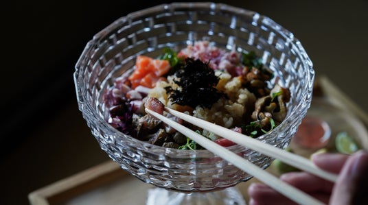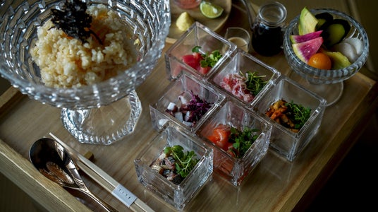 金沢といえば海鮮丼と言われるほど、金沢グルメの代名詞ともなっている海鮮丼。TILEでは、一般的な海鮮丼とは違い、薬味として位置付けているマイクログリーンと、約30種類の新鮮な魚介類や昆布〆などのネタから、お好きなネタをご自由に丼に盛り付けてお召し上がりいただく、体験型の海鮮丼を提供しています。シャリは通常の白シャリと、こだわりの赤酢を混ぜ合わせた赤シャリをご用意いたしました。