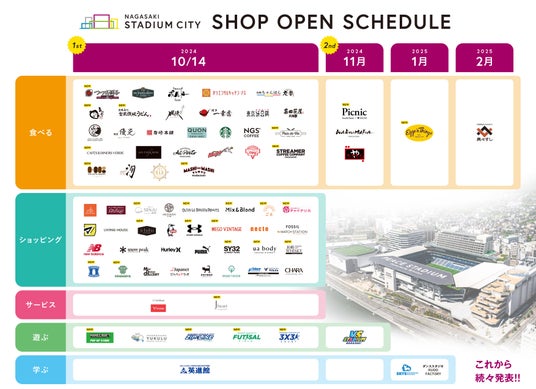 ジャパネットグループで地域創生事業を担う株式会社リージョナルクリエーション長崎(本社:長崎県長崎市/代表取締役社長:岩下英樹)は、2024年10月14日に開業する「長崎スタジアムシティ」に出展するテナント約80店舗のオープンスケジュールを公開いたします。初公開の21テナントを含む総計80テナントが長崎スタジアムシティに集結します。長崎発出店や長崎スタジアムシティ直営のオリジナル飲食など、10月14日から順次オープンしていきますので、ぜひお楽しみにお待ちください。