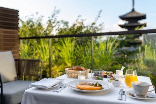 レストラン併設のテラス席からは、京都の西山を臨みながら朝食をお楽しみいただけます。オープンエアーな空間で絶景を見ながらの朝食は絶品です。