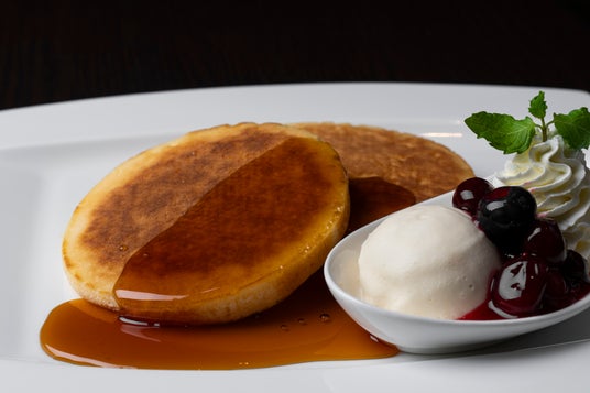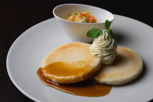 パンケーキ バニラアイスクリームとフルーツソース、京都ぽーく添え
