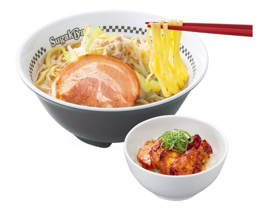 この度、「Sugakiya with」第3弾として、愛知県岡崎市にお店を構え、XやYouTubeでフォロワー数10万人を超える人気店「キブサチ」監修で、スガキヤ初の二郎系ラーメン「スガ・ジローラーメン」と、ガッツリ食べたい方も満足の「炭火焼き 焼き鳥丼」を2024年10月10日(木)よりスガキヤ252店舗で販売いたします。