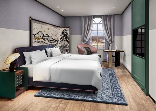 長崎観光を終えたゲストが館内へ一歩足を踏み入れると、出島の扇形を現代的に解釈したラグや、南山手の擬洋風建築の要素を取り入れた、長崎らしいユニークなデザインを始めとする設えが出迎えます。