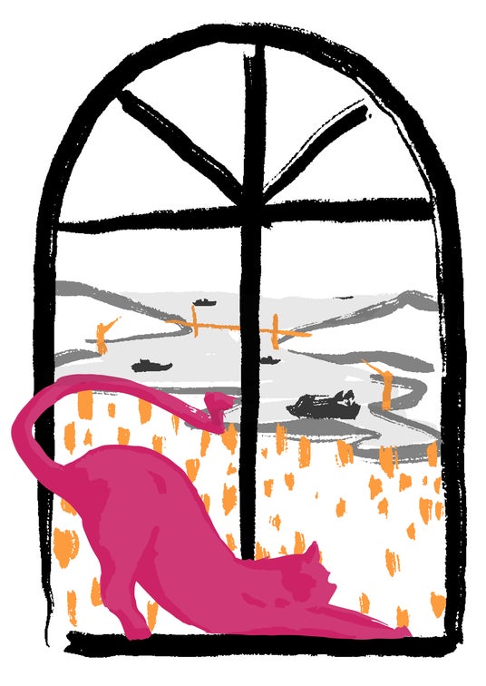 ホテルインディゴでは、ホテルのネイバーフッドにあるカルチャーを表現したイラストを作成し、ゲストにお楽しみいただいております。当ホテルでは、長崎県に生息する猫のうち79%を占めると言われる尾曲がり猫を採用しました。旧マリア園の象徴であるアーチ窓の先に見える港とともに背伸びをする尾曲がり猫の姿を通し、長崎のストーリーを表しています。