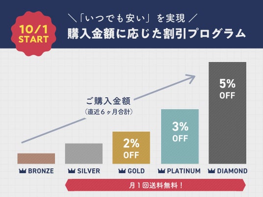全品ポイント5倍など、これまでにもさまざまなキャンペーンをご用意してきましたが、今回のリニューアルに伴い、新しい割引プログラムを導入しました。キャンペーン期間などを気にすることなく、仕入れが必要なタイミングで、いつでも安価に仕入れができる法人会員様限定のプログラムです。直近半年間のご購入金額に応じて、毎月会員様のランクが確定します。