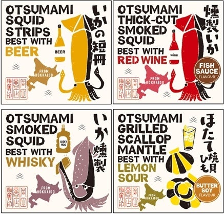 いままでのおつまみのイメージを一新する、カジュアルでかわいらしいイラストを使用し女性でも手に取りやすいパッケージ、サイズにしました。また「酒のための海のつまみ」のロゴ入りの化粧箱もご用意しましたので、お好きな組み合わせでギフトとしてのご利用にも最適です。おつまみの日本風のイメージも取り入れましたので海外の方のお土産等にもぜひご利用ください。