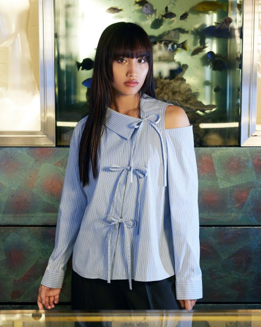 服の立体構造を保ちながらデザインのバランスをずらす繊細なプロセスが繰り返され、着る人を引き立たせるデザインが落とし込まれました。袖口のカフスが隠す手のバランスやシャツのボタンの開け方による肌の見せ方など、着る人によって多様な表現ができる細かいディテールがポイントです。