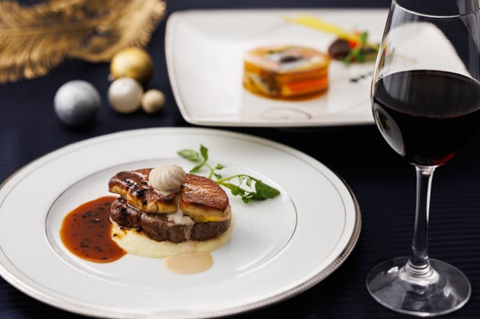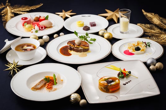 アミューズから始まる料理の数々は特別な日にふさわしいキャビアやフォアグラ、フカヒレなどの豪華食材も使用。前菜は「海の幸の宝石箱」をイメージして、ズワイガニ・アワビ・帆立・ウニをアスピックでご提供。スープはベースとなるコンソメにさらに野菜や牛肉を加え、じっくりと手間暇かけて仕上げた珠玉の一品。メインディッシュの肉料理には黒毛和牛フィレ肉を使用したロッシーニ風と、美食家でもあった作曲家ジョアキーノ・ロッシーニの名を関した料理で「音楽のまち・かわさき」で過ごすクリスマスにふさわしい料理をご用意します。