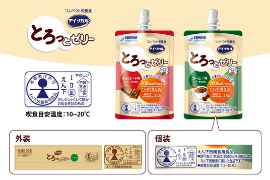 許可表示を反映したパッケージで販売するのは、「アイソカル(R) とろっとゼリー コーヒー味」と、「アイソカル(R) とろっとゼリー チョコレート味」の2製品。配送用梱包外装には許可表示マークを、製品個装には許可表示文言とマークを追加しています。