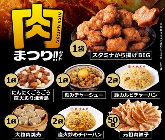 『大阪王将 肉まつりセット』は、その名の通り、お肉系の中華総菜を集めたガッツリ、ボリューム満点のセットです。人気の『元祖肉餃子』をはじめ、新商品『にんにくごろごろ直火炙り焼き鳥』や『刻みチャーシュー』、肉肉しい『大粒肉焼売』や『スタミナから揚げBIG』など、豪華7種をセットにしてご用意いたしました。さらに、『大阪王将 肉まつりセット』をご購入いただくと、抽選で50人に1人の割合でA5等級の国産黒毛和牛500gが当たるキャンペーンも実施いたします。食欲の秋、大阪王将の “肉中華”をお楽しみください。