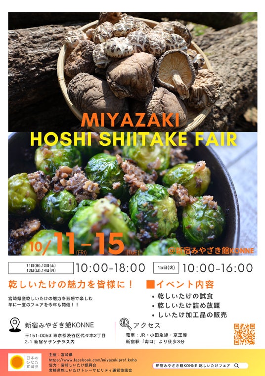 10月はきのこの需要が高まる時期です。このことから、10月15日は《きのこの日》と制定されています。これに合わせ、新宿みやざき館KONNEでみやざき乾しいたけフェアを開催します。