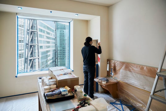 制作中のKOTOさん。制作にあたっては、窓から見える風景との調和を意識しビルの景観との相性が良い3418号室を選んだ