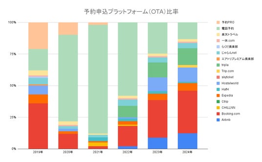 - インバウンド伸長とともに、予約申し込みが入るプラットフォーム(OTA)比率も変化している。Airbnb、HOSTELWORLDなど、インバウンド客が多く利用するプラットフォーム経由が増加傾向にある