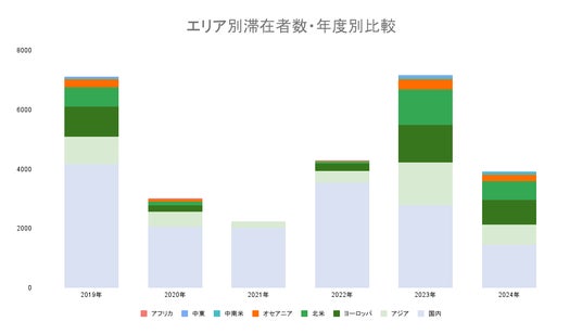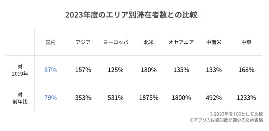 さらに、2023年のエリア別滞在者数を2019年および前年2022年と比較してみると、インバウンド客が総じてアジア・ヨーロッパ・北米中心に完全に復調したと言えます。絶対数は少ないながらも、2024年6月時点での数値も鑑みると、今後オセアニア・中南米も伸び代が期待できます。対して、国内客の利用者数は2019年対比67%と、2019年同水準には至っておらず、国内観光客が滞在するエリアや滞在先の宿としてのニーズの変化も垣間見ることができます。