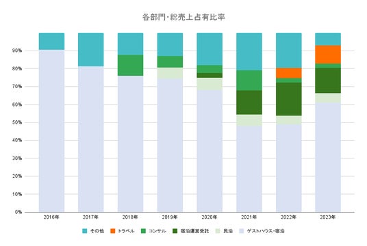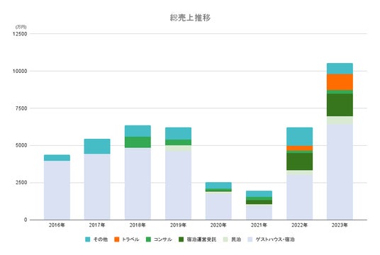 売上伸長の背景には、インバウンド需要拡大を背景とした各ゲストハウスでの売上伸長に加え、宿泊運営受託や2022年よりスタートしたトラベル事業(ツアー受託等)の拡大があります(※1)。2019年時点では収入がなかった宿泊運営受託・トラベル事業の収益が2020年以降、新たに加わっています。安定した経営のため、事業の多角化に向けてコロナ以前から準備を進めてきました。このように先んじて手を打っていたこともあり、コロナでのゲストハウス収益激減にも他事業が下支えとなったことで、持ち堪えることができました。コロナ禍を経てゲストハウス経営は完全復調、以前より進めてきた宿泊事業以外の事業も順調に伸長しており、今回の創業以来の最高利益を達成するに至っています。