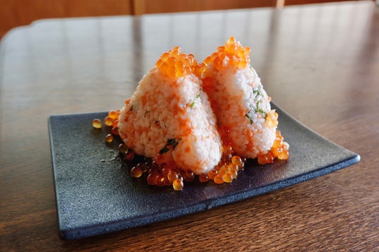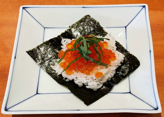 当店自慢の青森県産青天の霹靂、三重県の香り高い海苔、伯方の天然塩をつかってふっくらにぎったおむすびに「シラリカいくら」をたっぷりかけてご提供します。
