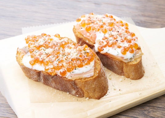 ブレッドの上に「シラリカいくら」、サーモン、サワークリームソースを贅沢にトッピングしました。お酒のお供にもぜひ。