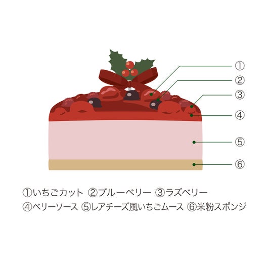 【Xmas トリプルベリーフロマージュ】(3,400円)/(税込・送料別) 甘酸っぱくさっぱりとした、いちごのレアチーズ風ケーキです。米粉スポンジの上に、いちごジャムの果肉入りレアチーズ風いちごムースを流し、ムースの上にはクリスマスリースに見立てて3種のベリーをトッピングしました。ベリーソースをたっぷりかけたクリスマスにぴったりな真っ赤なケーキです。