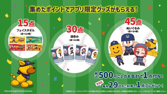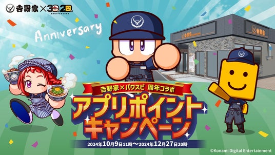 今回のキャンペーンのために描き下ろした株式会社コナミデジタルエンタテインメントの野球ゲームに登場するキャラクターとのコラボグッズが登場。普段使いもしやすい『フェイスタオル(4種)』をはじめ、飲み物を飲む際にご使用いただける『湯呑み(4種)』、吉野家の制服を着た各キャラクターの抱き心地の良い大きさ15cmの『ぬいぐるみ(4種)』といった、ここでしか手に入らないオリジナルグッズを用意しています。この機会にぜひ、可愛さ溢れる描き下ろしのオリジナルグッズを手に入れてください。