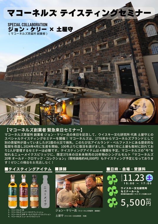 株式会社ウイスキー文化研究所(本社:東京都渋谷区、代表:土屋守)は、2024年11月23日(土)に北アイルランド・ベルファストで2024年4月から生産開始したマコーネルズ蒸留所の創業者 ジョン・ケリー氏と弊社代表でウイスキー評論家の土屋守によるスペシャルテイスティングセミナーを開催いたします。【公式ページ】https://scotchclub.org/eventseminar/