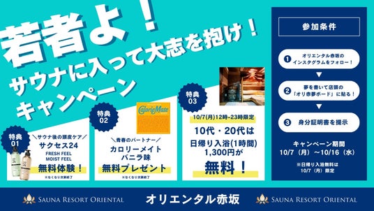 そこで、「サウナリゾートオリエンタル赤坂」は若者が夢を持てるように、そしてその夢を応援するために、「若者よ!サウナに入って大志を抱け!」キャンペーンを実施いたします。