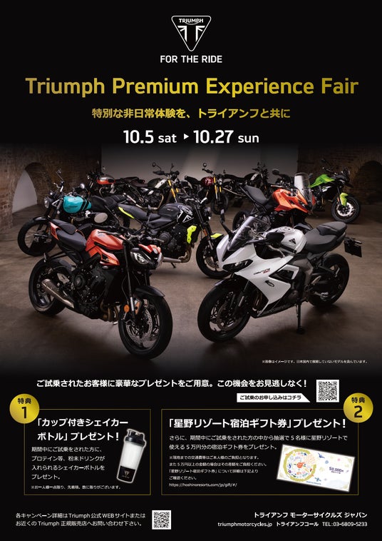 トライアンフモーターサイクルズジャパン株式会社(代表取締役社長:大貫 陽介 - 東京都港区) は、10月5日(土)~10月27日(日)までの期間中、10月のキャンペーンとして全国のトライアンフ正規販売店にて「PREMIUM EXPERIENCE FAIR」の開催をお伝えします。