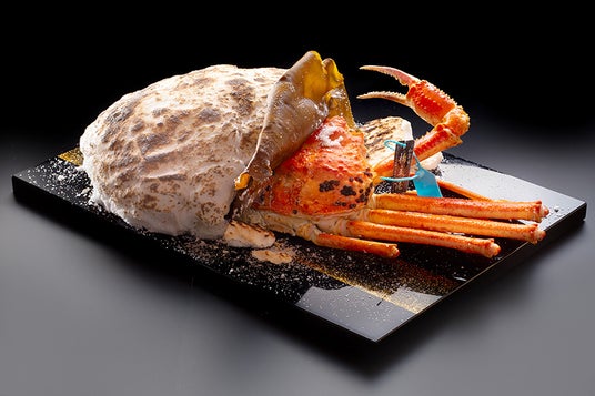 吉祥自慢の名物「塩釜昆布焼き」は、タグ付きの加能ガニ1杯を丸ごと昆布と塩で包み込み、蟹の繊細な甘みと濃厚な旨みを閉じ込め、じっくりと焼き上げます。