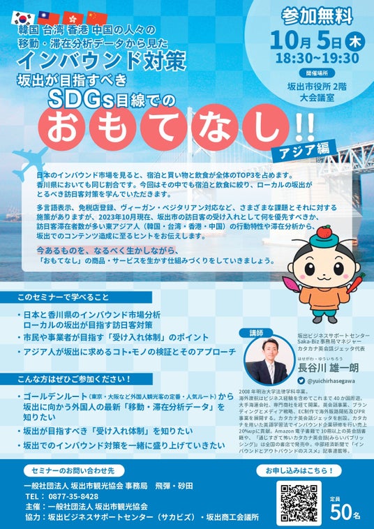 株式会社JETTA(以下「JETTA」)代表取締役・長谷川雄一朗は、2023年10月5日、坂出市観光協会様との共催により、インバウンド対策セミナー「韓国・台湾・香港・中国の人々の移動・滞在分析データからみたインバウンド対策 坂出が目指すべきおもてなし!!? アジア編」を開催しました。