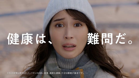 木枯らしが吹き落ち葉がひらひらと舞う冬の季節に、寒さ対策をした広瀬さんへ天の声(天海さん)が「みなさーん、冬の健康対策は?」と呼びかけるシーンから始まります。自信ありげに「してますよ~!」と答える広瀬さん。そこへ突然、天海さんが登場し「でもね、去年の冬を元気に過ごせなかったと感じた家族が6割も!」と衝撃の事実を伝えると、広瀬さんは「そんなぁ~」と驚きながら、「健康は、難問だ。」と痛感します。(※生活習慣は規則正しく、バランスの良い食事、適度な運動、十分な睡眠が基本です。)