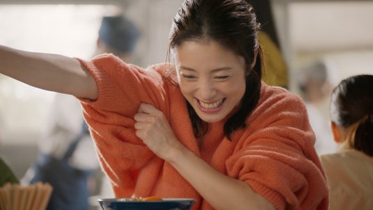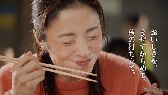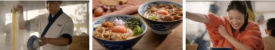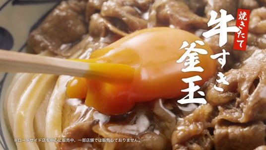 その後、あつあつの「釜抜き麺」にじゅわっと牛肉、まろやかな玉子とからめてうまい秋の限定商品『焼きたて牛すき釜玉うどん』が映ると「いっちゃいますか!」と袖をまくる上戸さんの姿が映ります。最後には、『旨辛 肉盛りまぜ玉うどん』と『焼きたて牛すき釜玉うどん』が、画面いっぱいに映し出され、本TVCMを締めくくります。