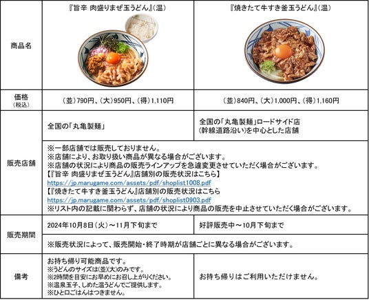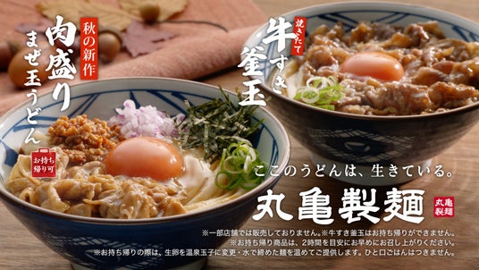 今回のTVCMに登場する秋の限定商品『旨辛 肉盛りまぜ玉うどん』と『焼きたて牛すき釜玉うどん』は、麺職人※が全店にいる丸亀製麺が提供する、打ち立て、茹でたての麺に、まろやかな玉子をからめて味わう商品です。毎日すべての店で100%国産小麦、塩、水のみを使い、職人が打つ麺と、玉子、さらにこだわりの具材がからみ合うことで生まれる、三位一体のおいしさをご堪能ください。